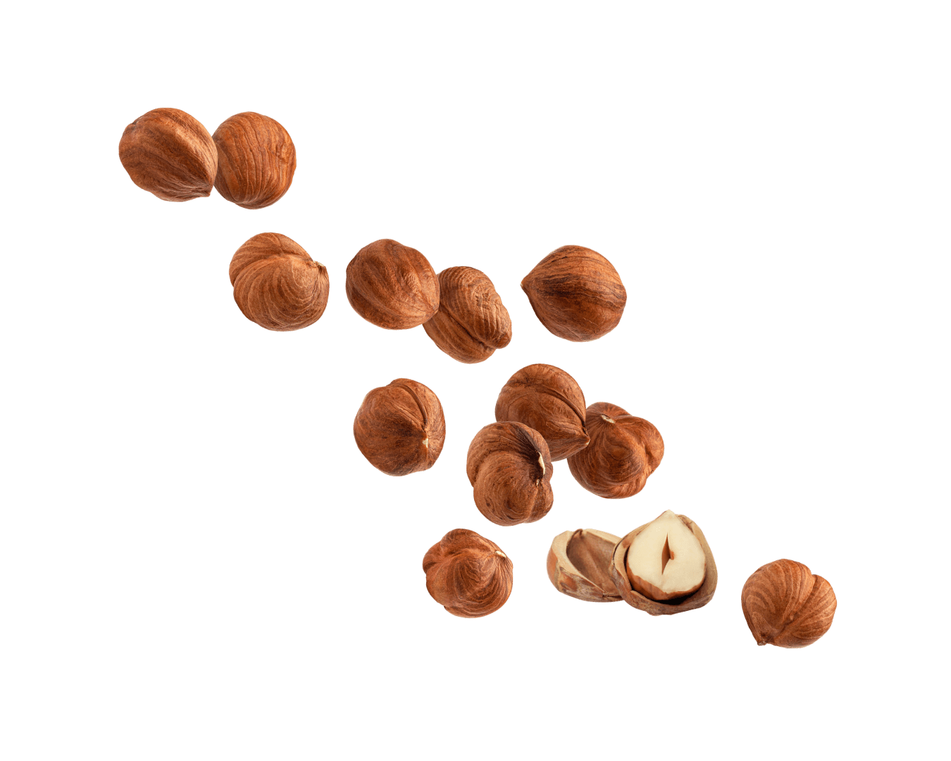 Noisettes du Piémont IGP, reconnues pour leur saveur douce, intense et légèrement sucrée, apportant un croquant unique à nos créations.
